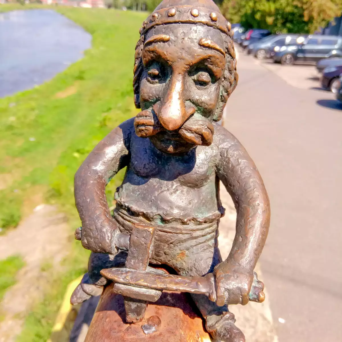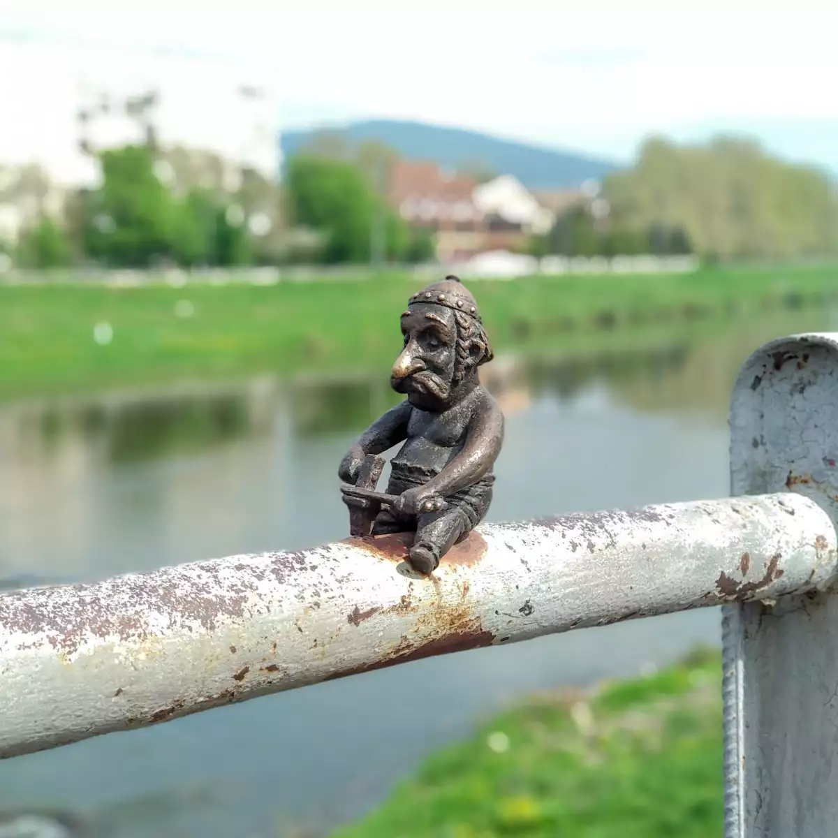Die Mini-Skulptur “Kelte” befindet sich auf dem Geländer des Mukatschewo-Damms, mit dem Berg Lowachka im Hintergrund (GPS: 48.44376373 22.71705627).