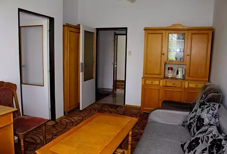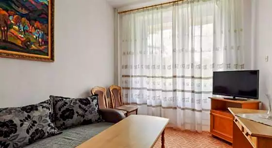 - Комплектація номера: велике ліжко, розкладний диван, телевізор, холодильник, санвузол (душ, туалет, умивальник), балкон.