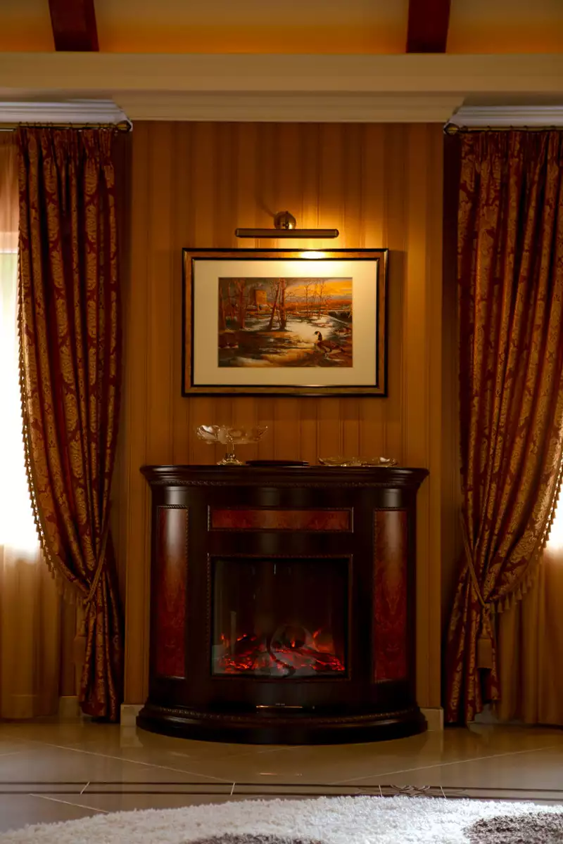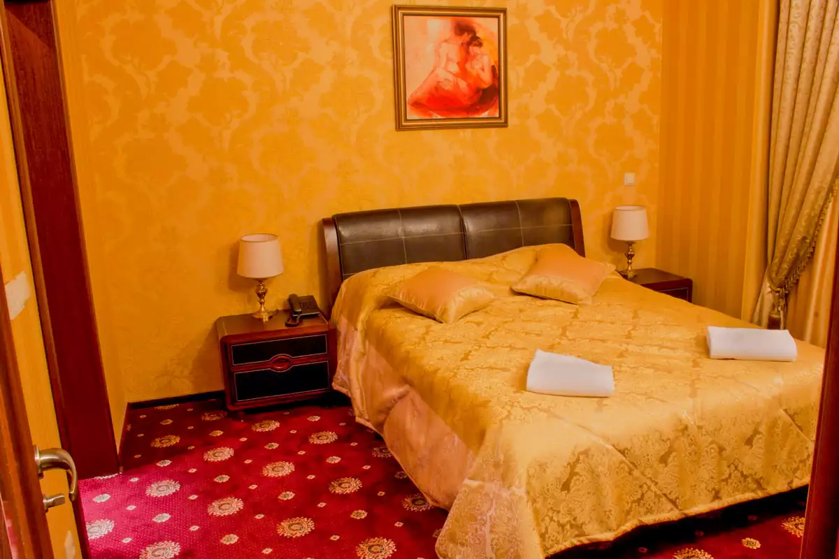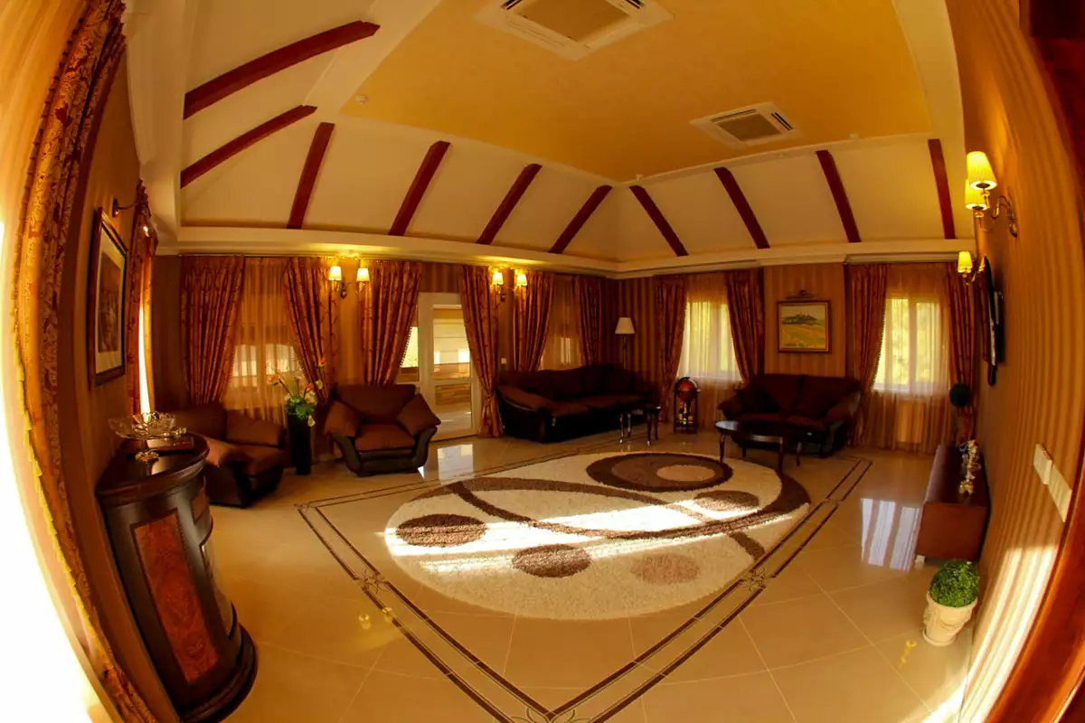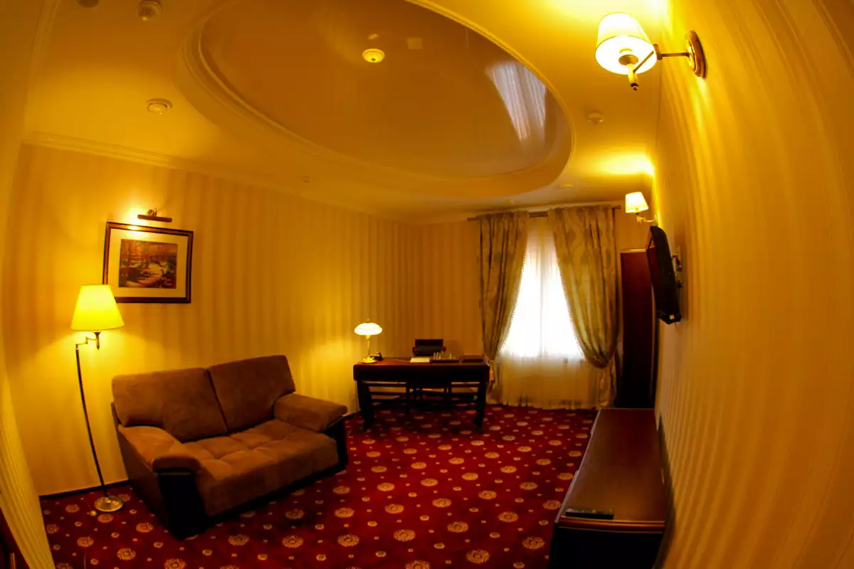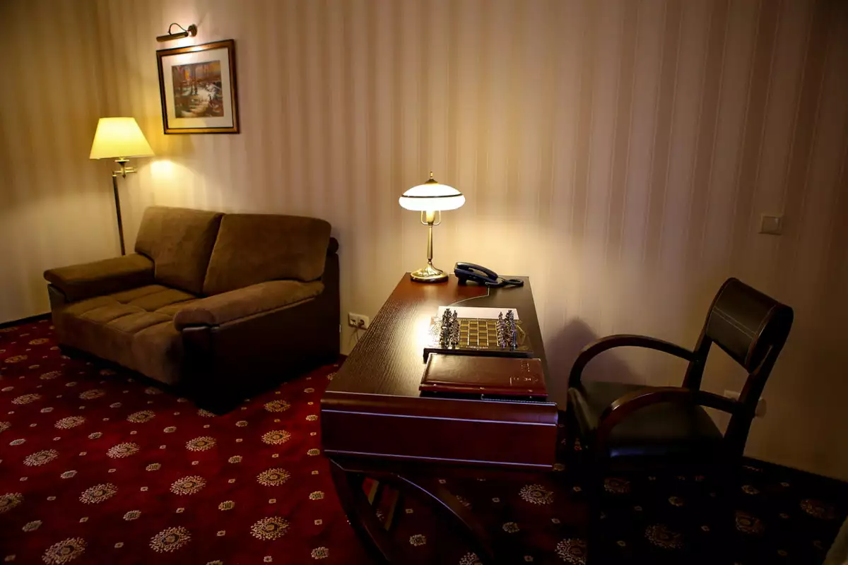 У номері 2 спальні кімнати, 2 суміщених санвузла (туалет, умивальник, душова, ванна, фен, банні халати, косметика) двоспальне ліжко в кожній кімнаті, м’яка частина, крісла, камін, робочий кабінет, шафа-купе, сейф, 2 телевізори (кабельне ТБ), кондиціонер, міні-бар, велика тераса з розсувними вікнами і плетеним меблевим гарнітуром.