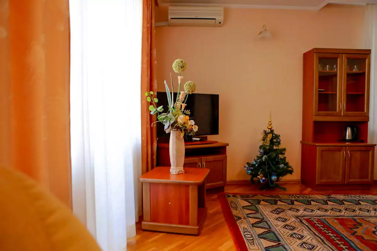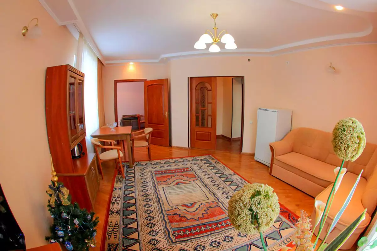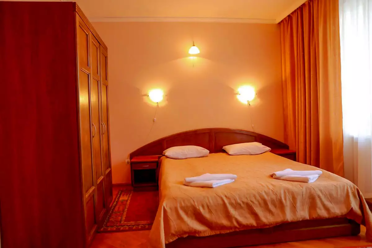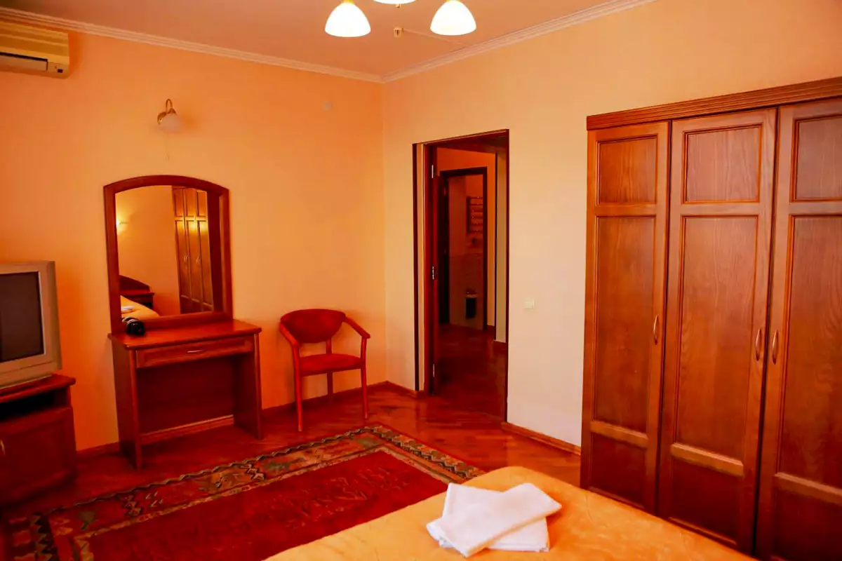 Апартаменти (5 трикімнатних номерів) — передпокій (шафа для одягу, холодильник, електрочайник, посуд), вітальня (м’яка частина, телевізор, балкон), спальня (двоспальне ліжко, телевізор, балкон), дитяча (2 односпальні ліжка, розкладний диван), 2 санвузли (ванна або душ, туалет, умивальник, фен).