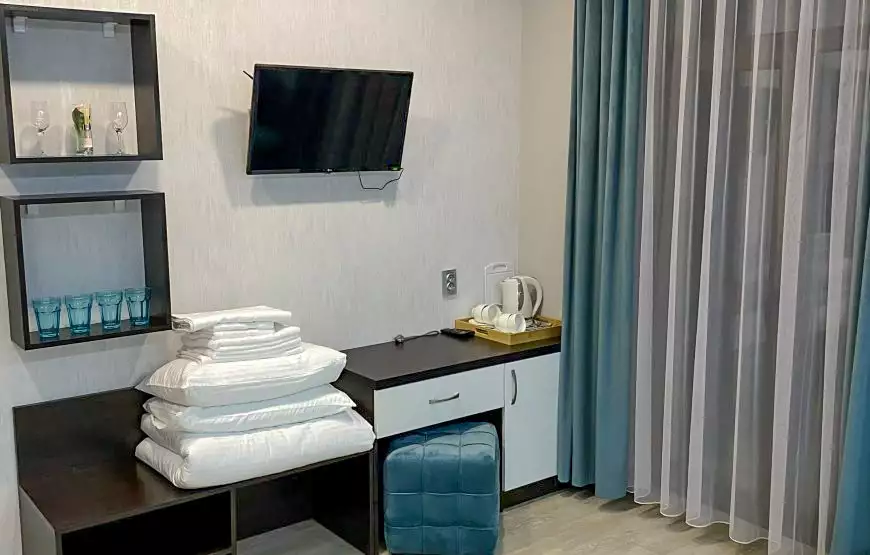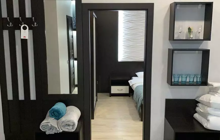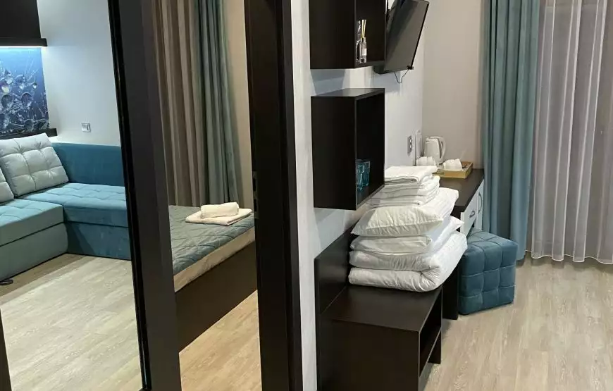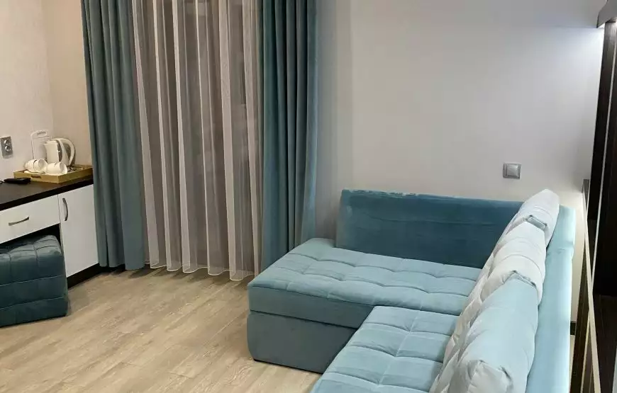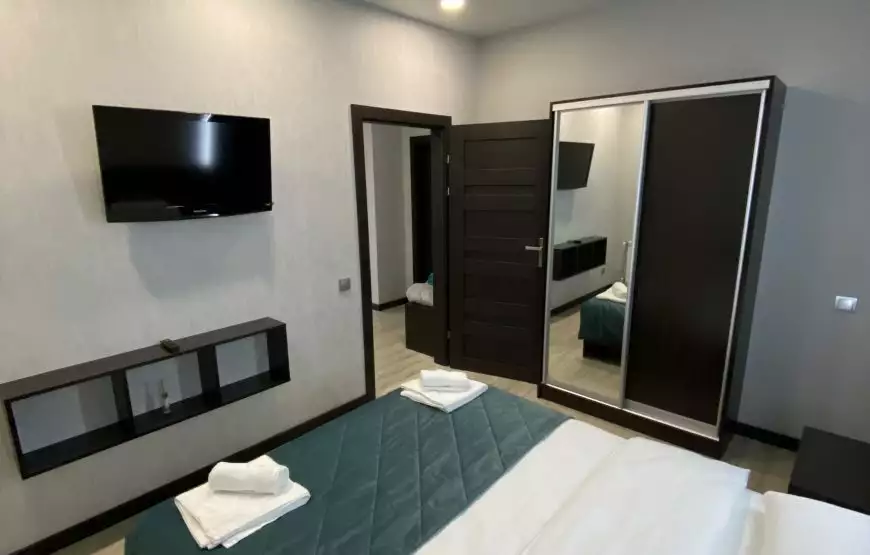 Вишуканий двокімнатний номер люкс площею 33кв.м., з двоспальним ліжком, великим розкладним диваном, меблями з натуральної деревини, теплою підлогою, плазмовим телевізором, супутниковим ТБ, Wi-fi, з терасою з видом на гори та гірську річку: