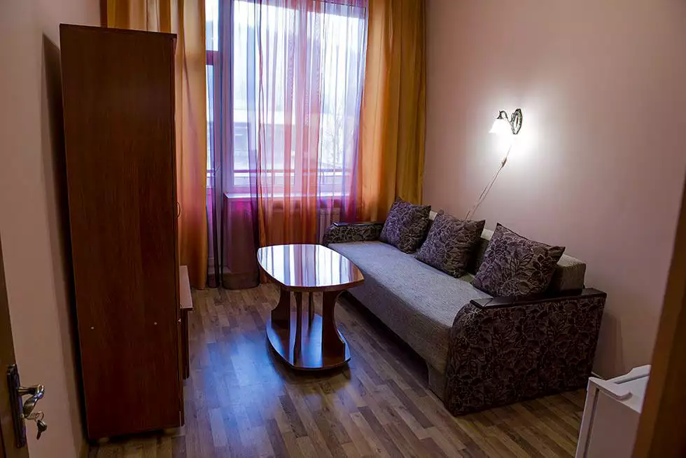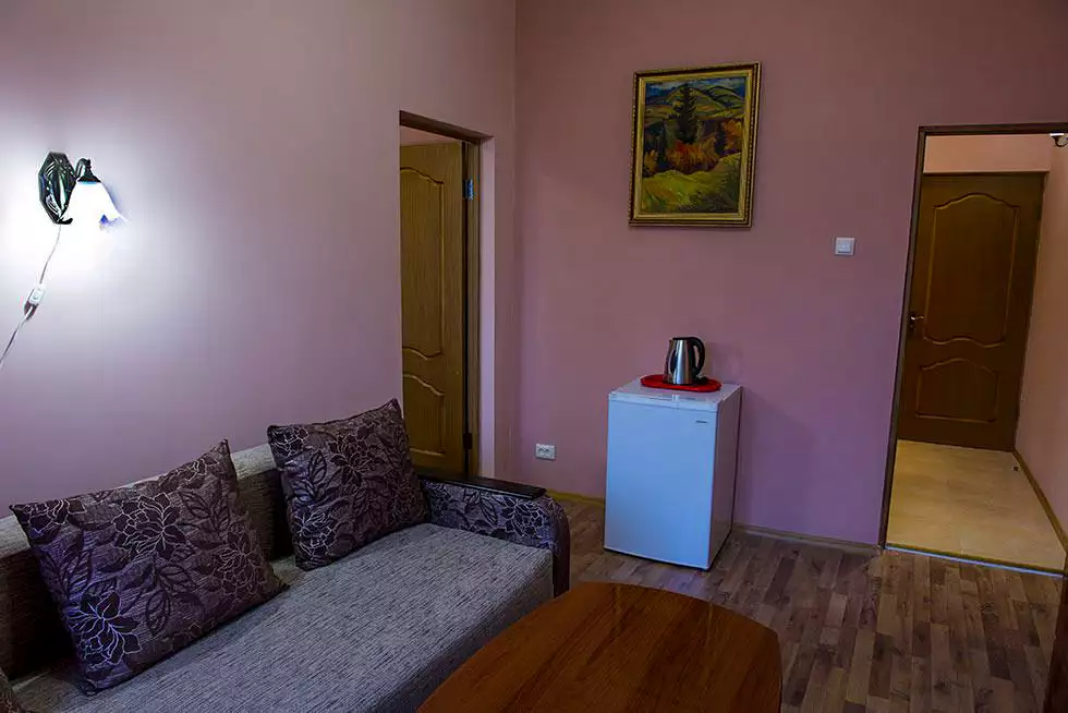 Комфортний номер із сучасним інтер’єром з усіма зручностями та балконом. У номері холодильник, телевізор, санвузл, душ. Водопостачання холодної та гарячої води цілодобове.