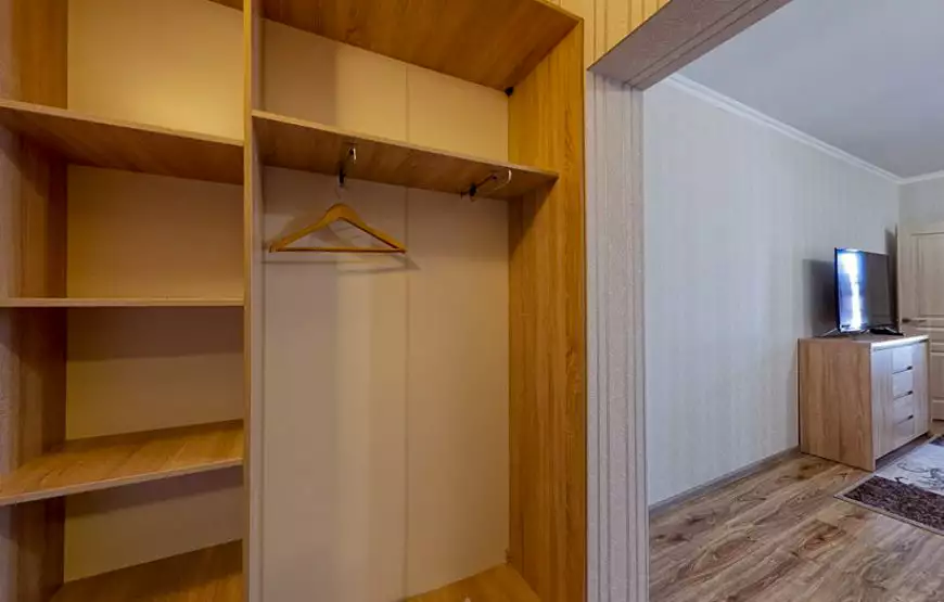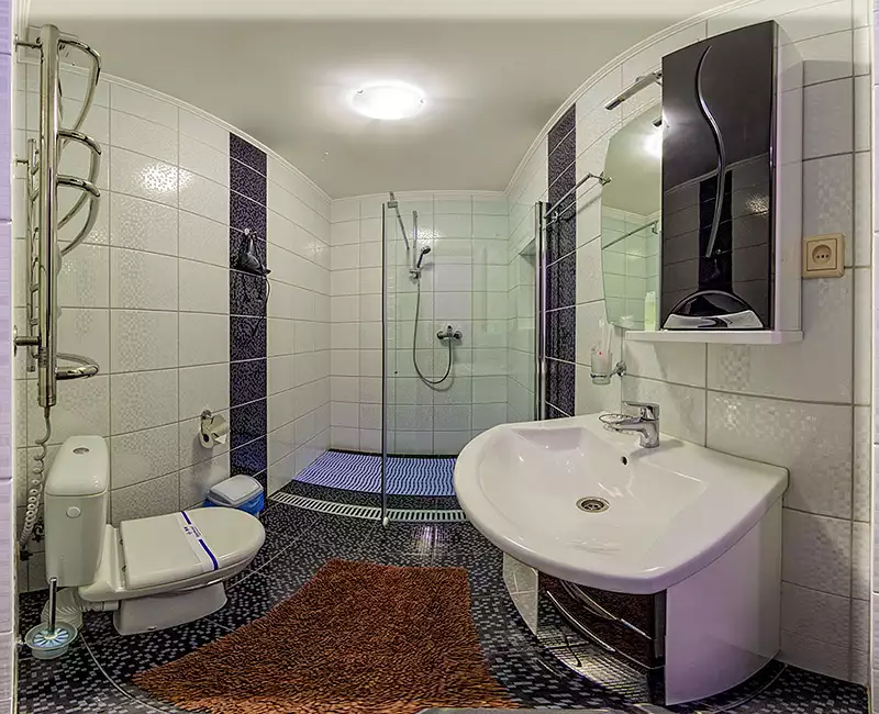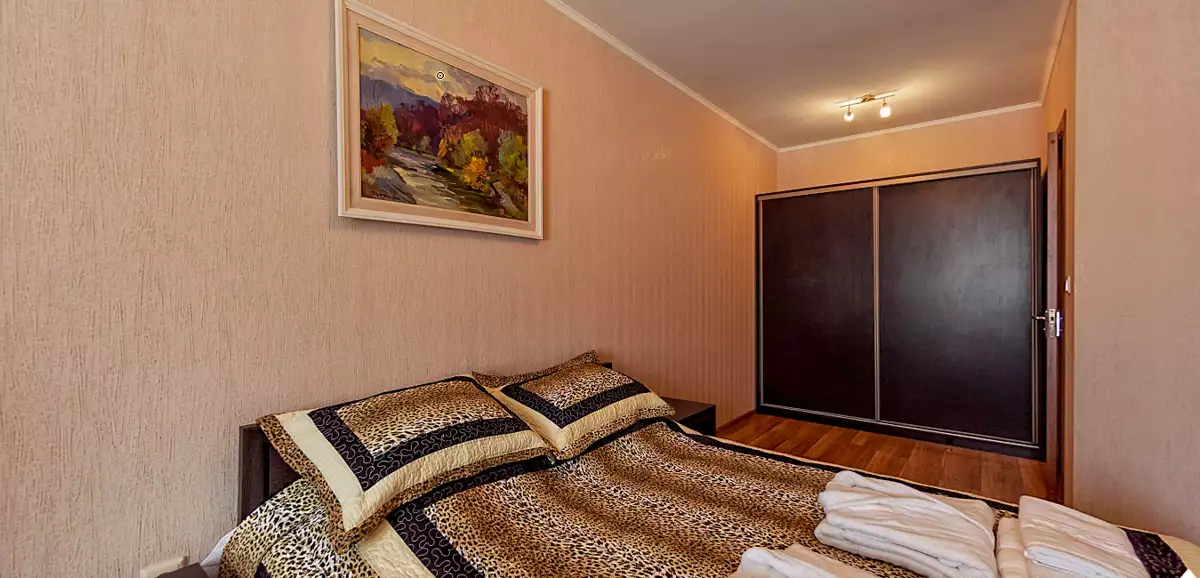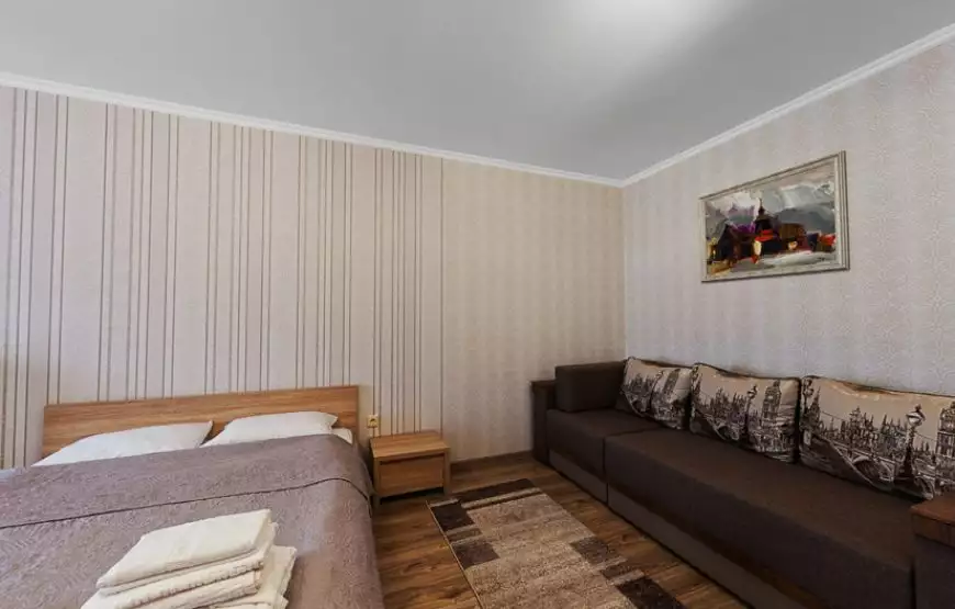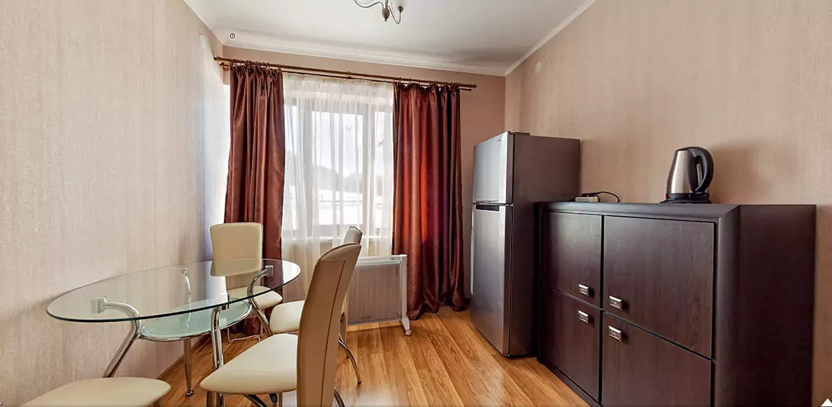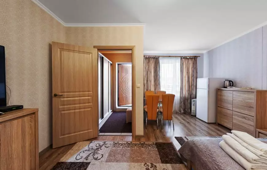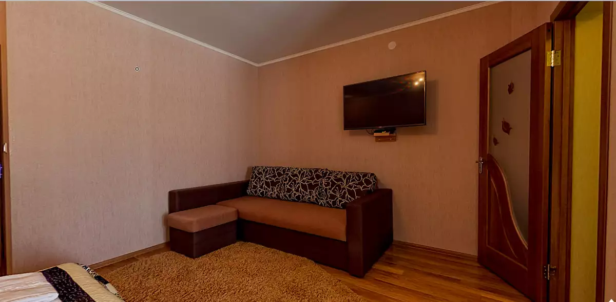 - кімната з виходом на вулицю (двоспальне ліжко, приліжкові тумби, шафа-купе, комод, плазмовий телевізор, розкладний м’який куточок, обідній скляний стіл, 4 стула, електрочайник, холодильник)