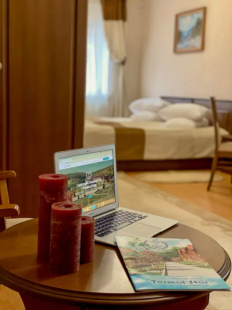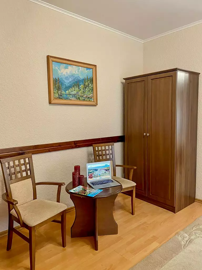 У номері: набір меблів, сейф, кондиціонер, телефон, телевізор, Wi-Fi, холодильник, халати, ванна кімната (душова, фен, набір рушників).