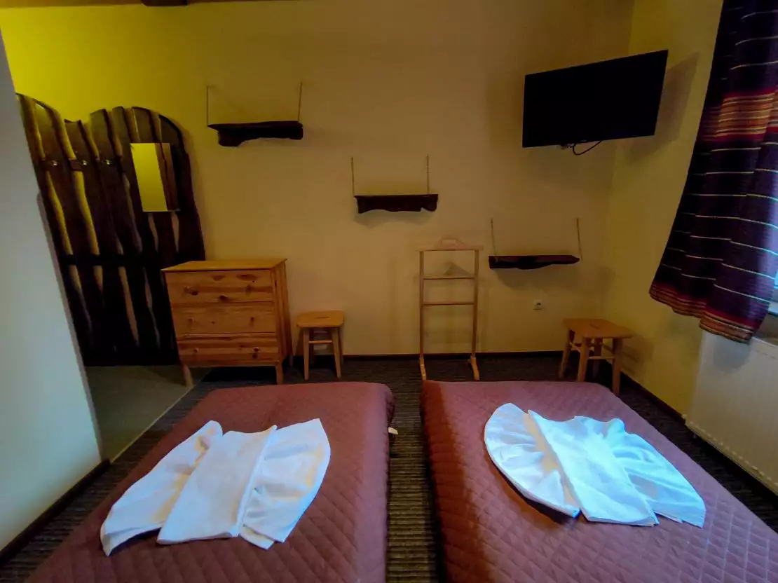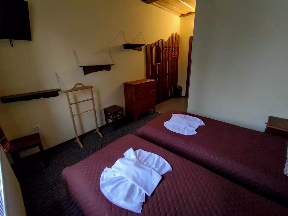 Двомісний номер площею 16 м. кв. з двома окремими ліжками, власною ванною кімнатою і мінімально необхідною кількістю меблів. Також є 32′ телевізор.