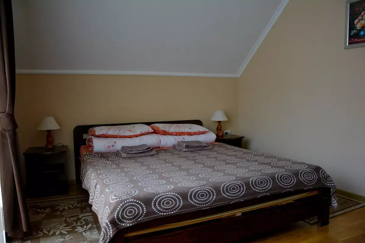 Двомісний номер у садибі Смерекова хата. У номері є двоспальне ліжко, шафа для одягу, телевізор, стіл зі стільцями, санвузол (душова кабіна, туалет, умивальник, фен).