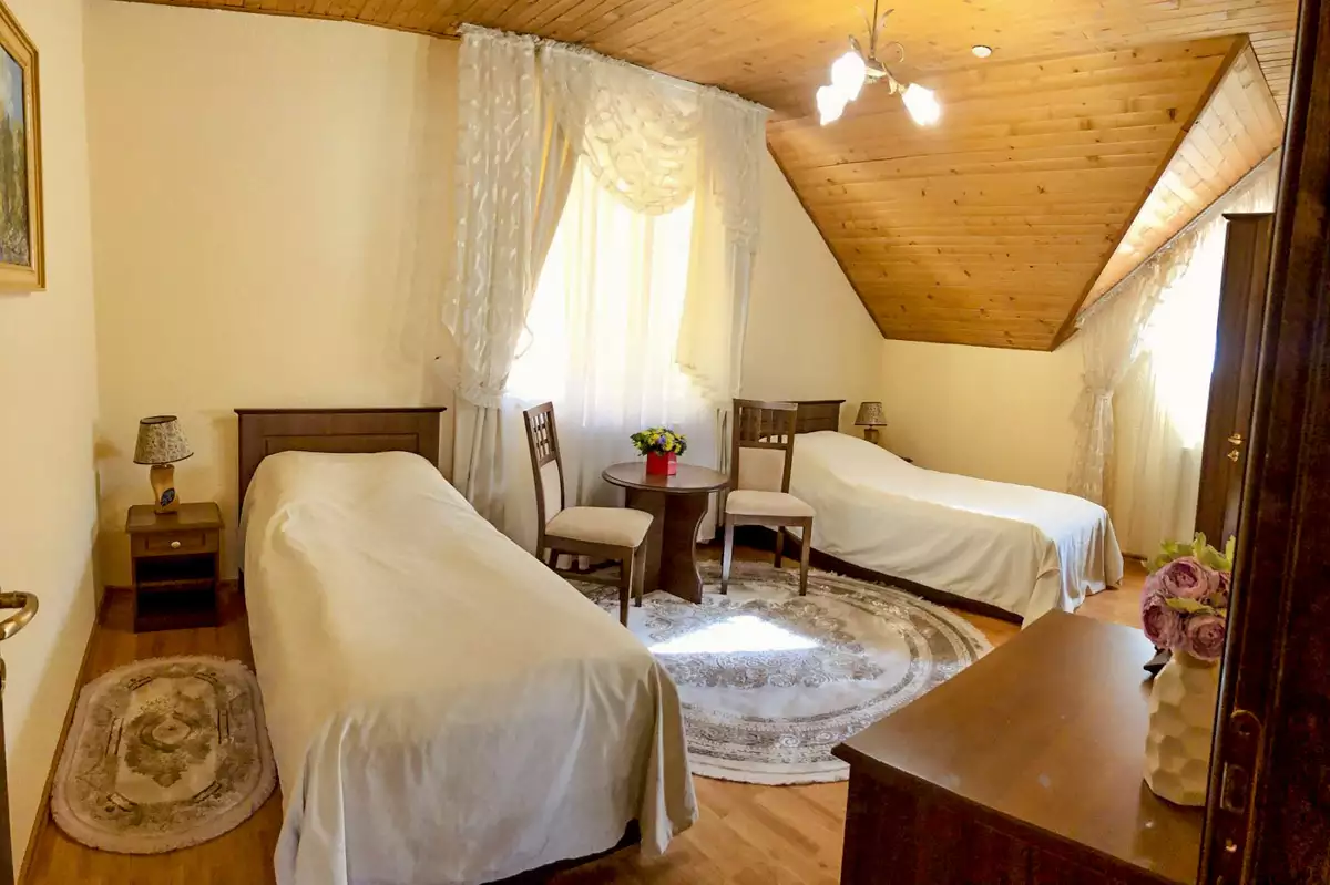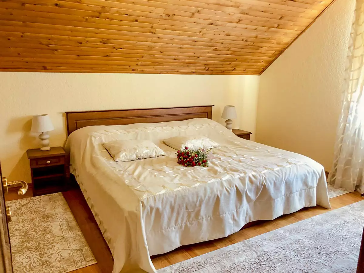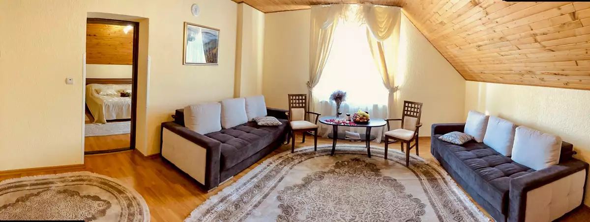Просторий трьох кімнатний номер на другому поверсі дерев’яного котеджу, площею 75 м². Має дві спальні, дві ванні кімнати та зручну вітальню. Чудово підійде для відпочинку з друзями та родиною.