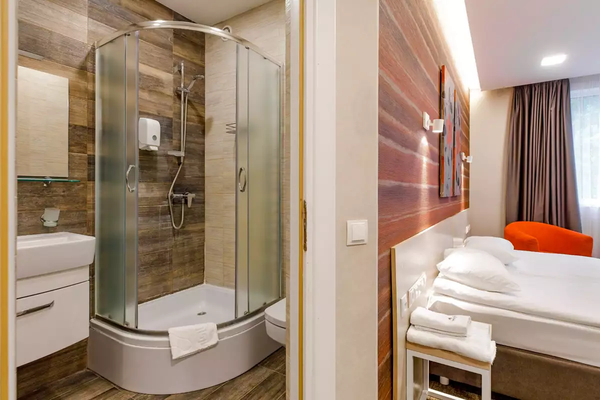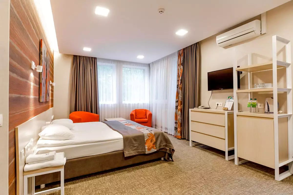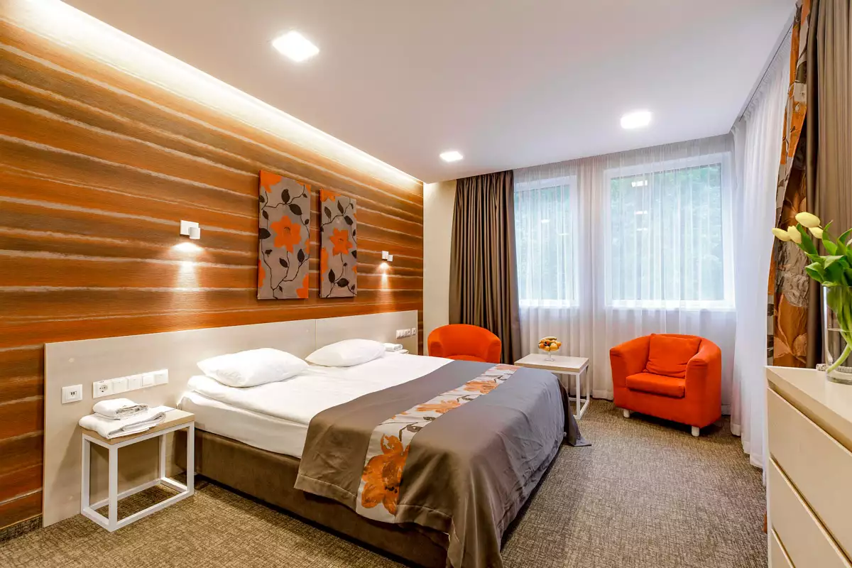 Зручний однокімнатний двомісний покращений номер “Комфорт” оформлений в сучасному стилі з широким та зручним ліжком.