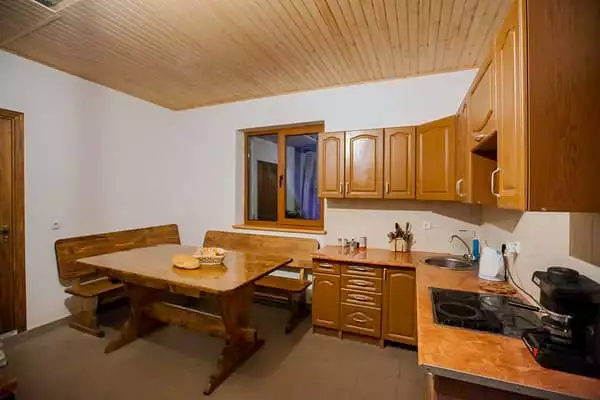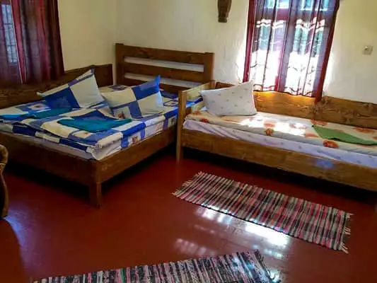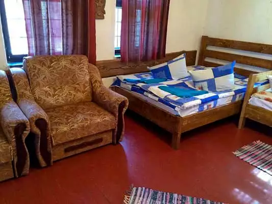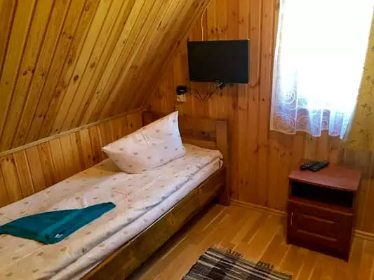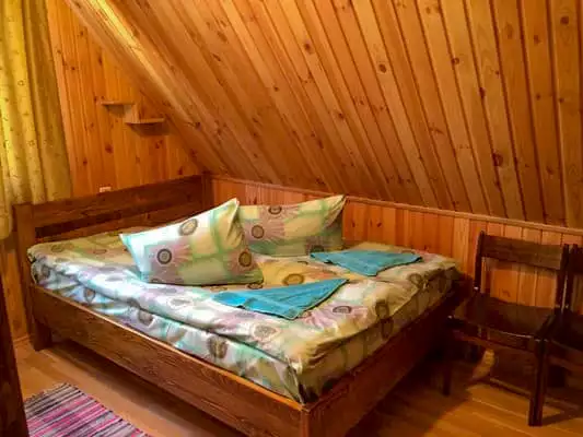 Двоповерховий котедж повністю обладнаний всім необхідним для комфортного проживання. На першому поверсі знаходиться кухня-їдальня і вітальня з каміном, де є односпальне і двоспальне ліжка, а також два розкладні крісла. На другому поверсі – один дві спальні (двомісний і тримісний номери відповідно).