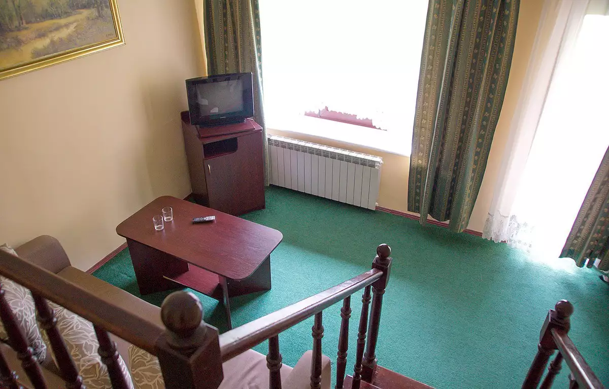 Люкс – комфортабельний двокімнатний номер у трьох рівнях. На першому поверсі знаходиться санвузол та шафа для одягу, на другому – вітальня з двоспальним диваном та виходом на балкон, на третьому – спальня з двома односпальними ліжками або двоспальним ліжком. Поруч зі спальнею окремий санвузол. Дозволить зручно розмістити сім’ю з 4-х осіб.