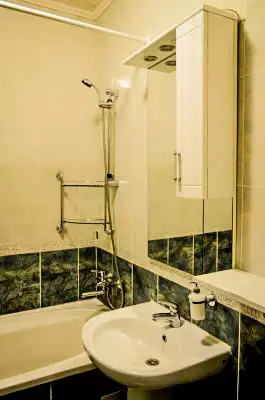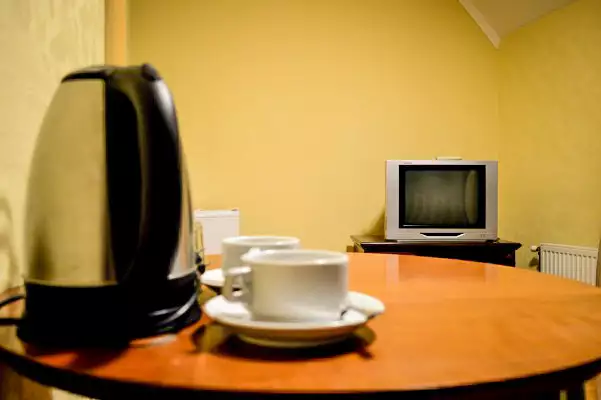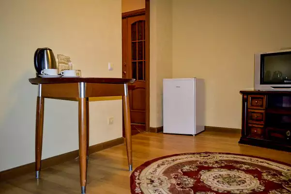 У номері є передпокій, санвузол 4,5 кв. м. з феном, двоспальне ліжко у спальні, 2 телевізора, холодильник, електричний чайник, чашки для чаю, стіл з двома стільцями, графін і дві склянки, великий розкладний диван у вітальні.
