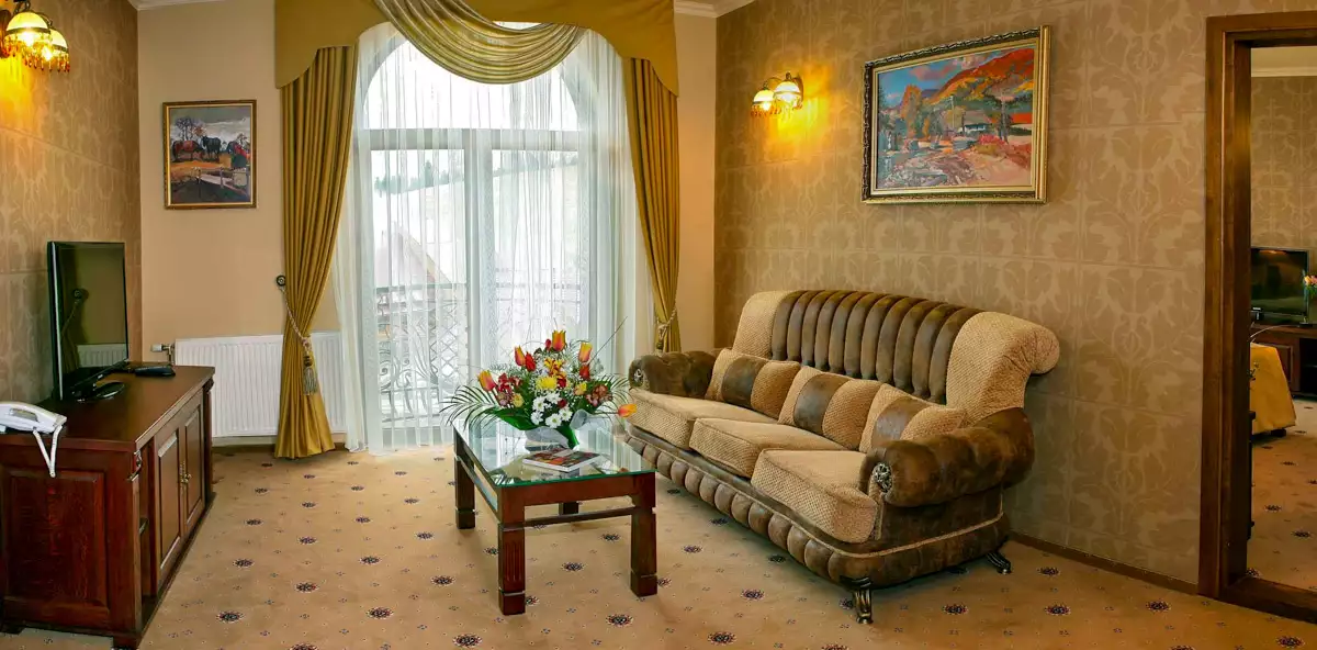 Номери категорії люкс в Гранд Готелі Пилипець дозволяють гостям насолоджуватися відпочинком в горах, затишно розмістившись в одній з 2-х кімнат номеру – вітальні або спальні.