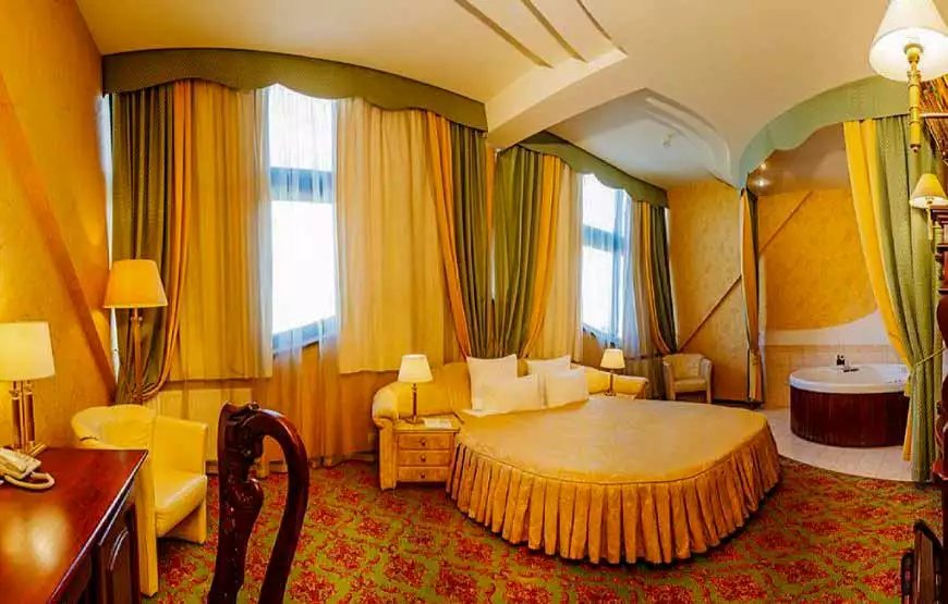 Неймовірно романтичний номер для двох Медовий місяць Делюкс пронизаний особливою атмосферою завдяки оригінальному ліжку круглої форми діаметром понад два метри. Ще однією родзинкою номеру є гідромасажна ванна, розташована безпосередньо біля ліжка.