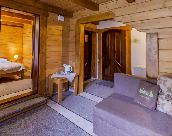 Напівлюкс покращений – двокімнатний номер площею 40-48 м. кв. (спальня, вітальня) . В кожному номері холодильник, санвузол, душова кабінка та балкон.
