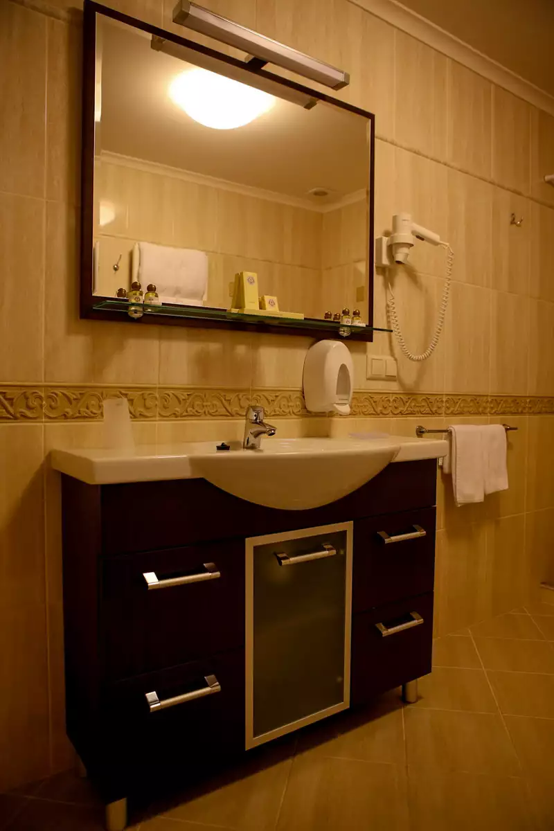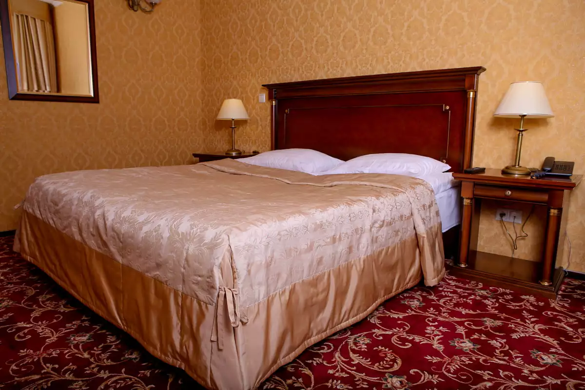 У номері суміщений санвузол (туалет, умивальник, душова, фен, банні халати, косметика), двоспальне ліжко, робочий стіл, диван, шафа-купе, сейф, телевізор (кабельне ТБ), кондиціонер, міні-бар, 2 балкона.