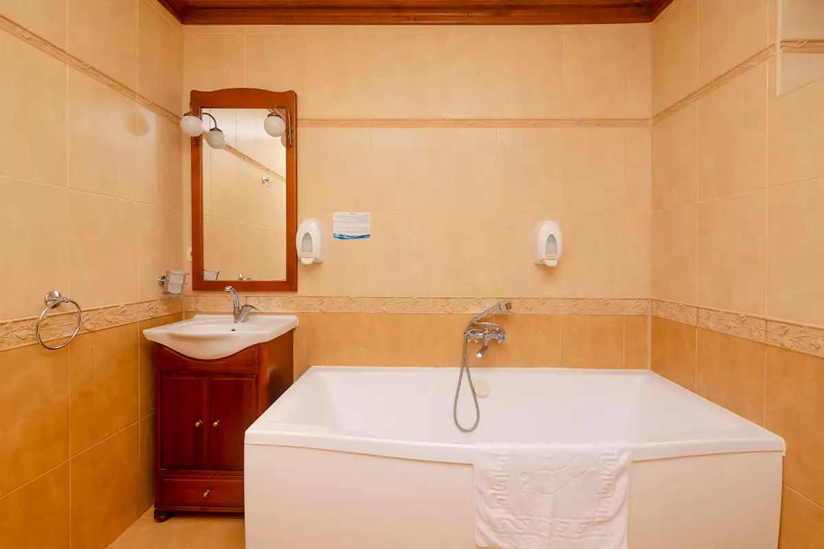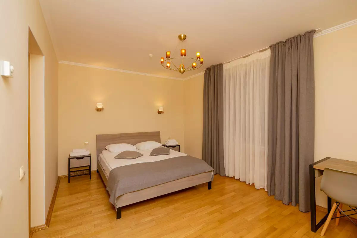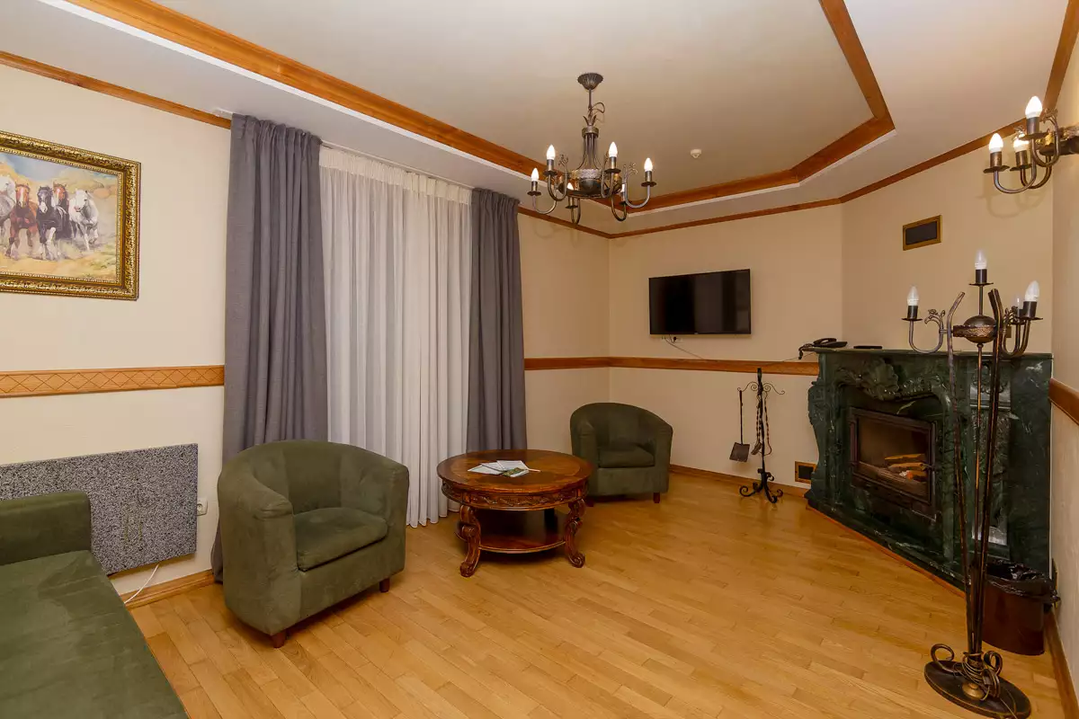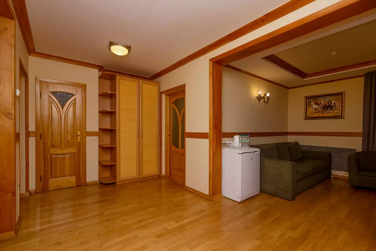 Просторий чотирикімнатний номер у дерев’яному коттеджі на першому поверсі. Котедж розташований відокремлено і чудово підходить для великої родини до 6 осіб.