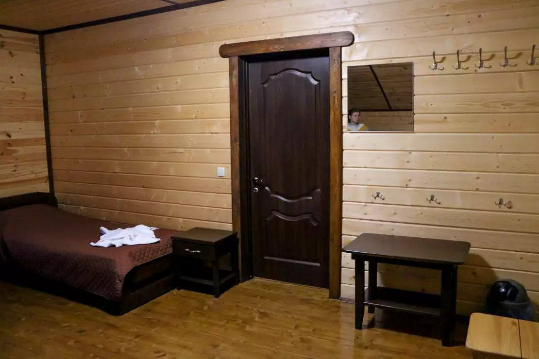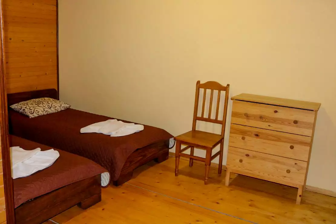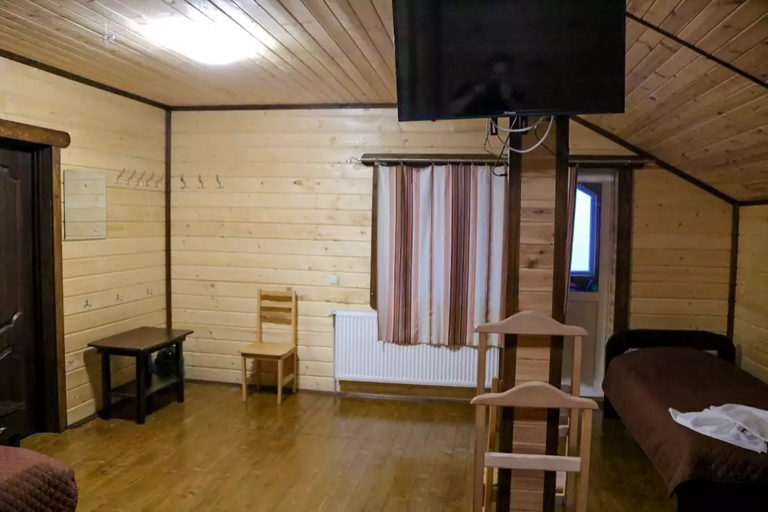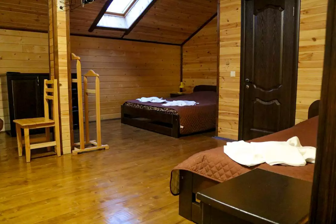 Чотиримісний номер площею 25 м. кв. з одним великим двоспальним ліжком (160х200см) та двома односпальними (90х200 см) ліжками, власною ванною кімнатою, мінімально необхідною кількістю меблів. Є 32′ телевізор.