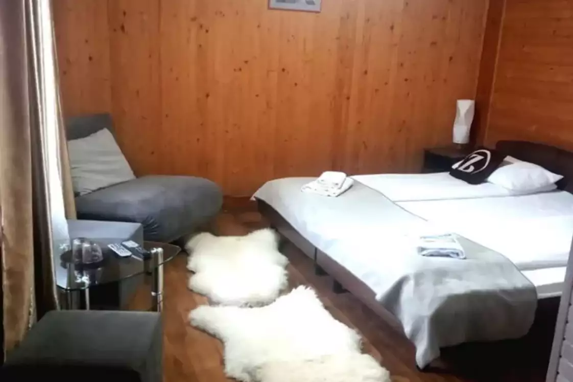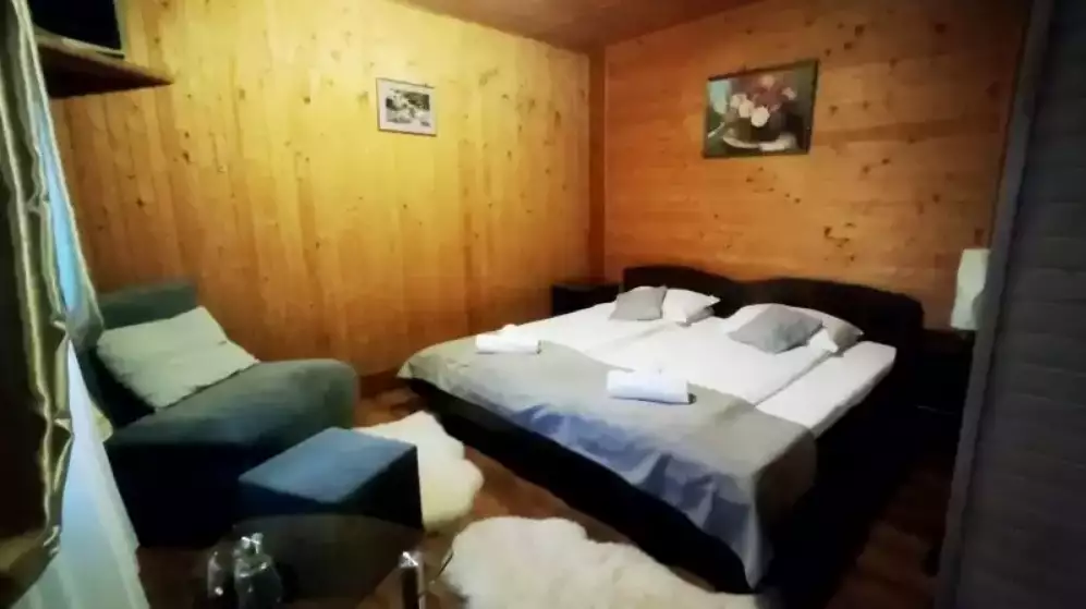 Комплектація номеру: 1 двоспальне ліжко або 2 односпальних, шафа, крісло-ліжко, набір мініпарфумерії, санвузол, душ, умивальник, фен, телевізор, супутникове ТБ, Wi-Fi, окремий вхід, вид з номера на гори, килими на підлозі.