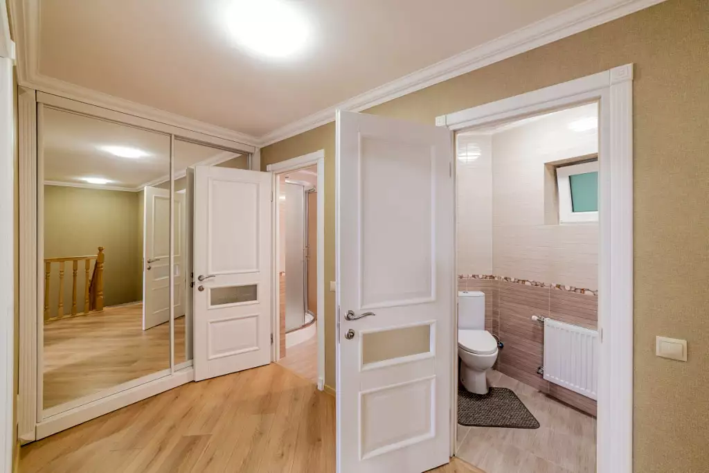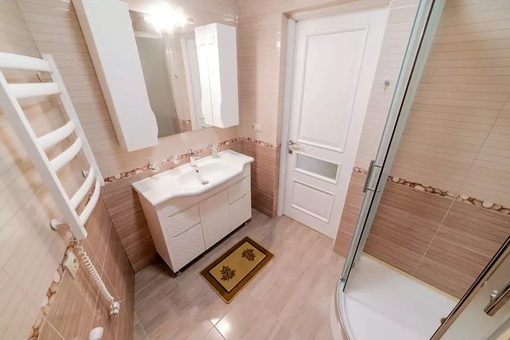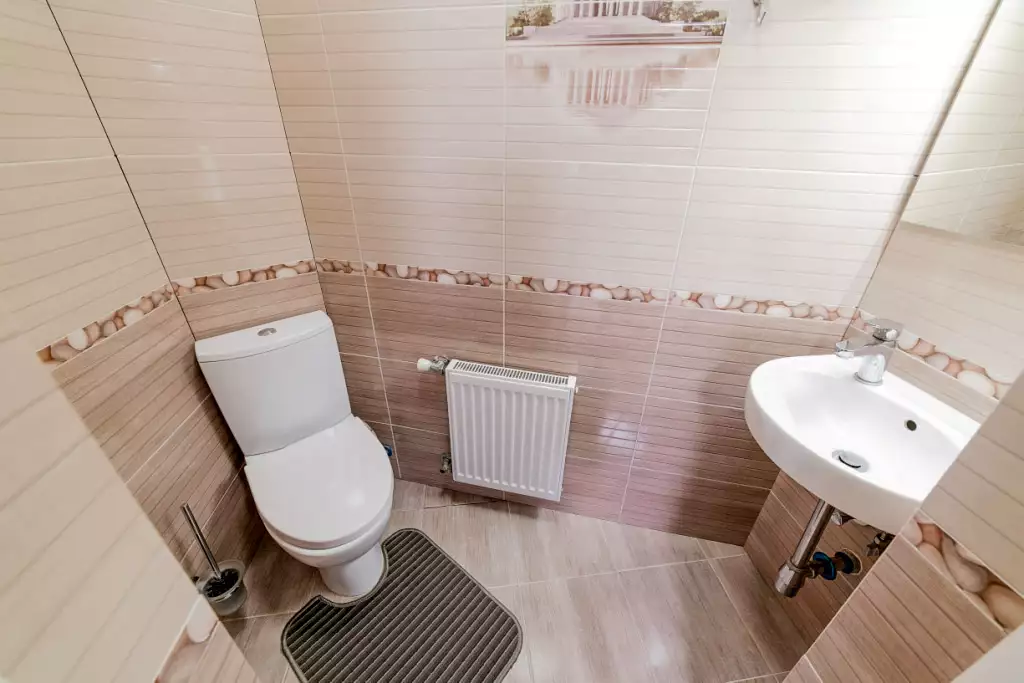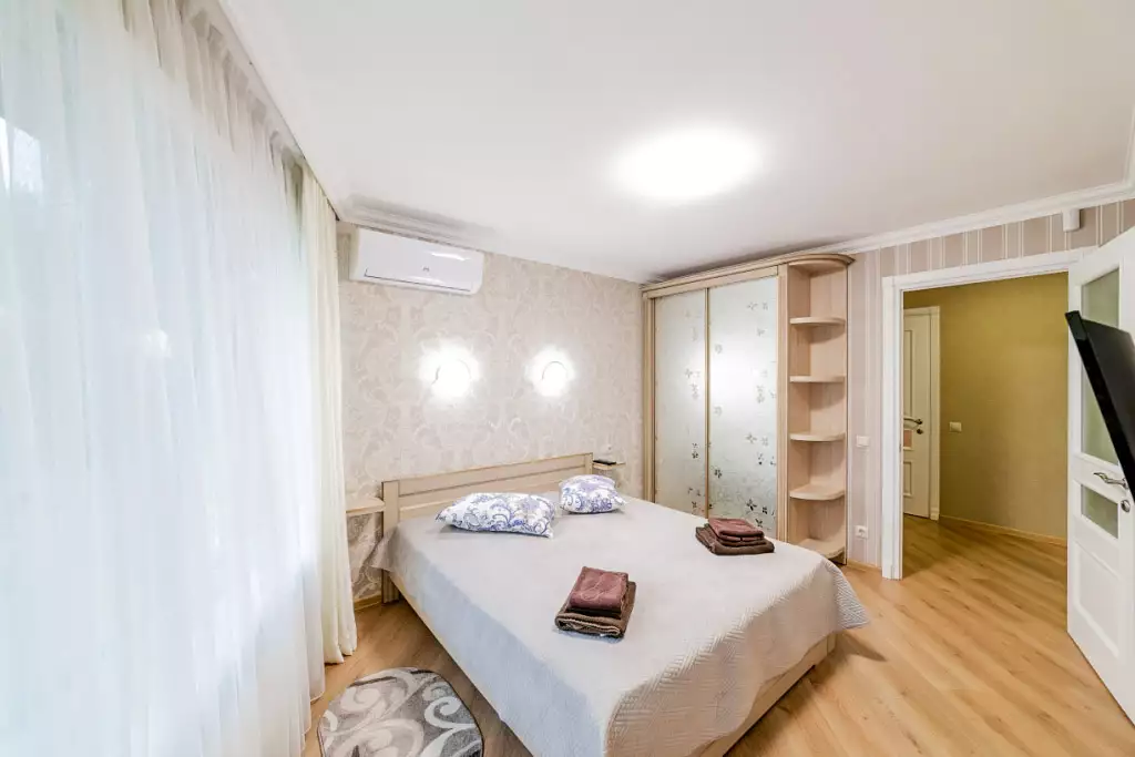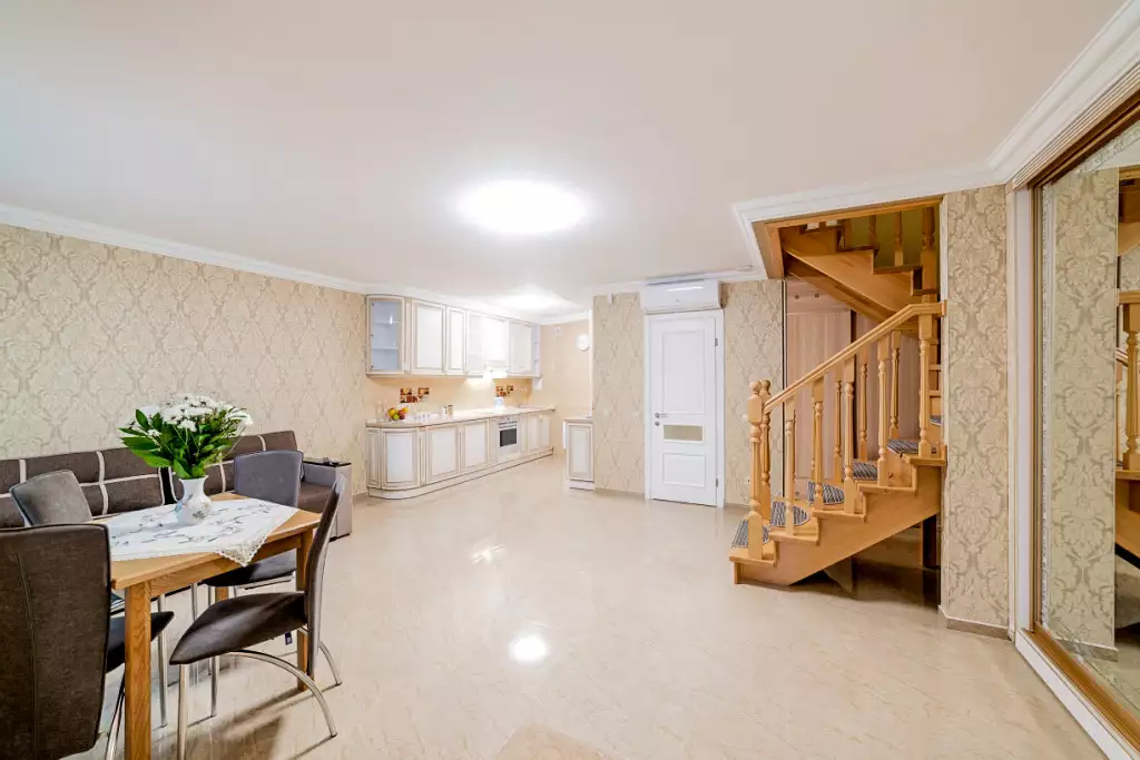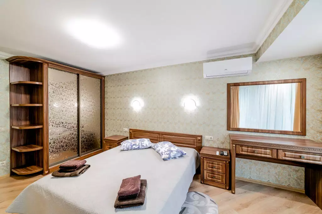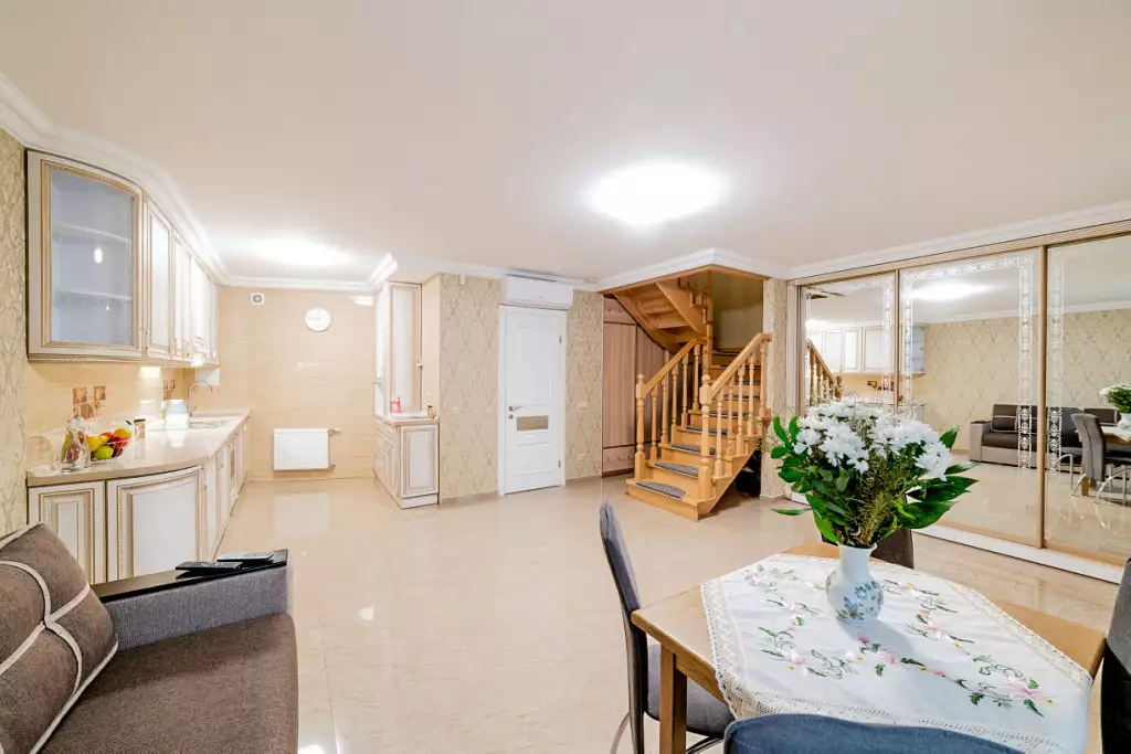 Таунхаус 3-кімнатний (комплектація номеру): душ, 2 санвузли, холодильник, праска, прасувальна та сушильна дошка для одягу, телевізор, кондиціонери, електричний чайник, фен, автономне опалення, власна зона для відпочинку на подвір’ї.