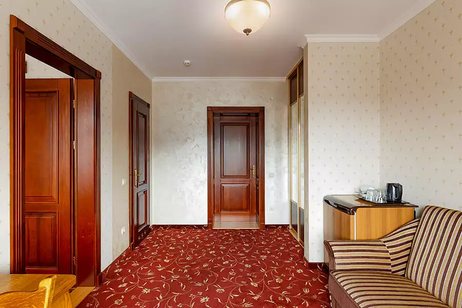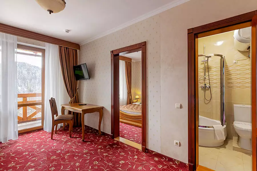 Напівлюкс – двокімнатний номер для комфортного розміщення 2-4 гостей. Зручності: двоспальне ліжко і розкладне ліжко-диван, окрема ванна кімната. Балкон в апартаментах відкриває краєвид на карпатські пейзажі. Два телевізори з супутниковими каналами, безкоштовний WiFi, телефон, сейф, холодильник та шафа для одягу – у цьому номері є все необхідне для комфортного відпочинку.
