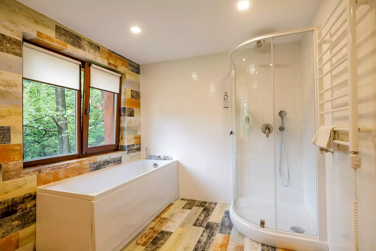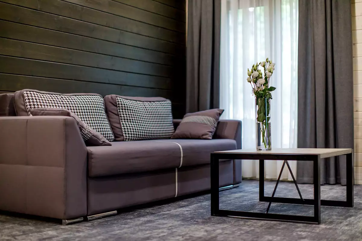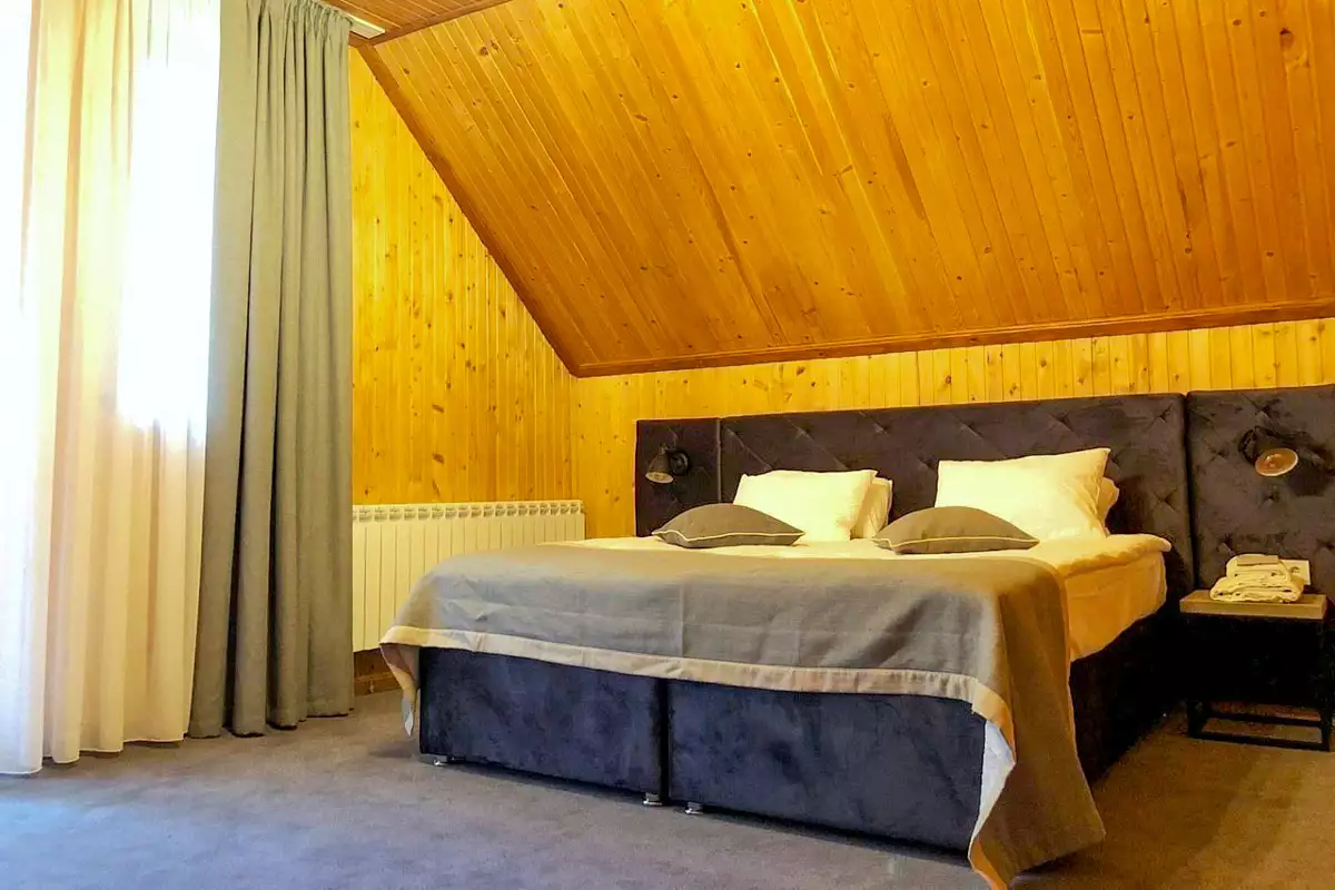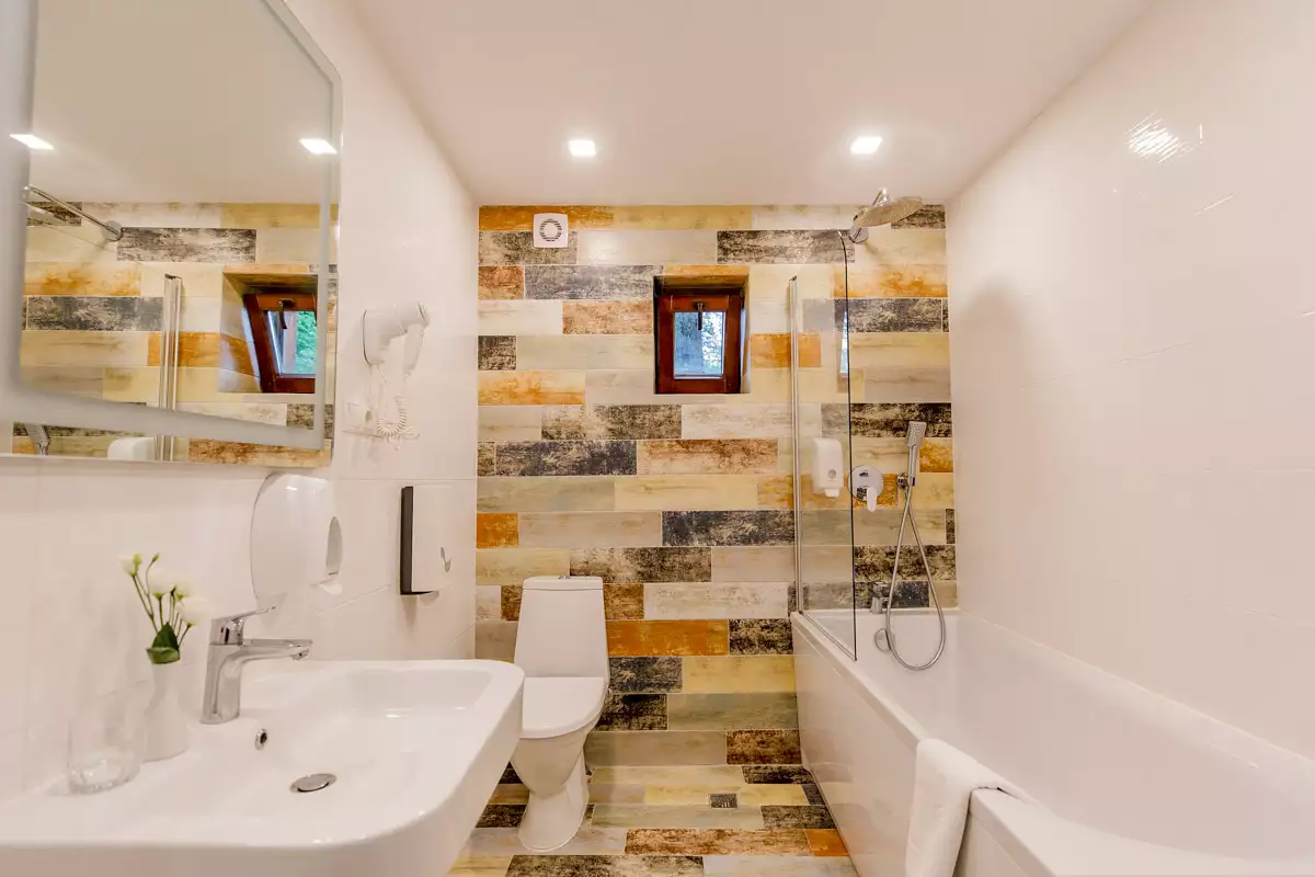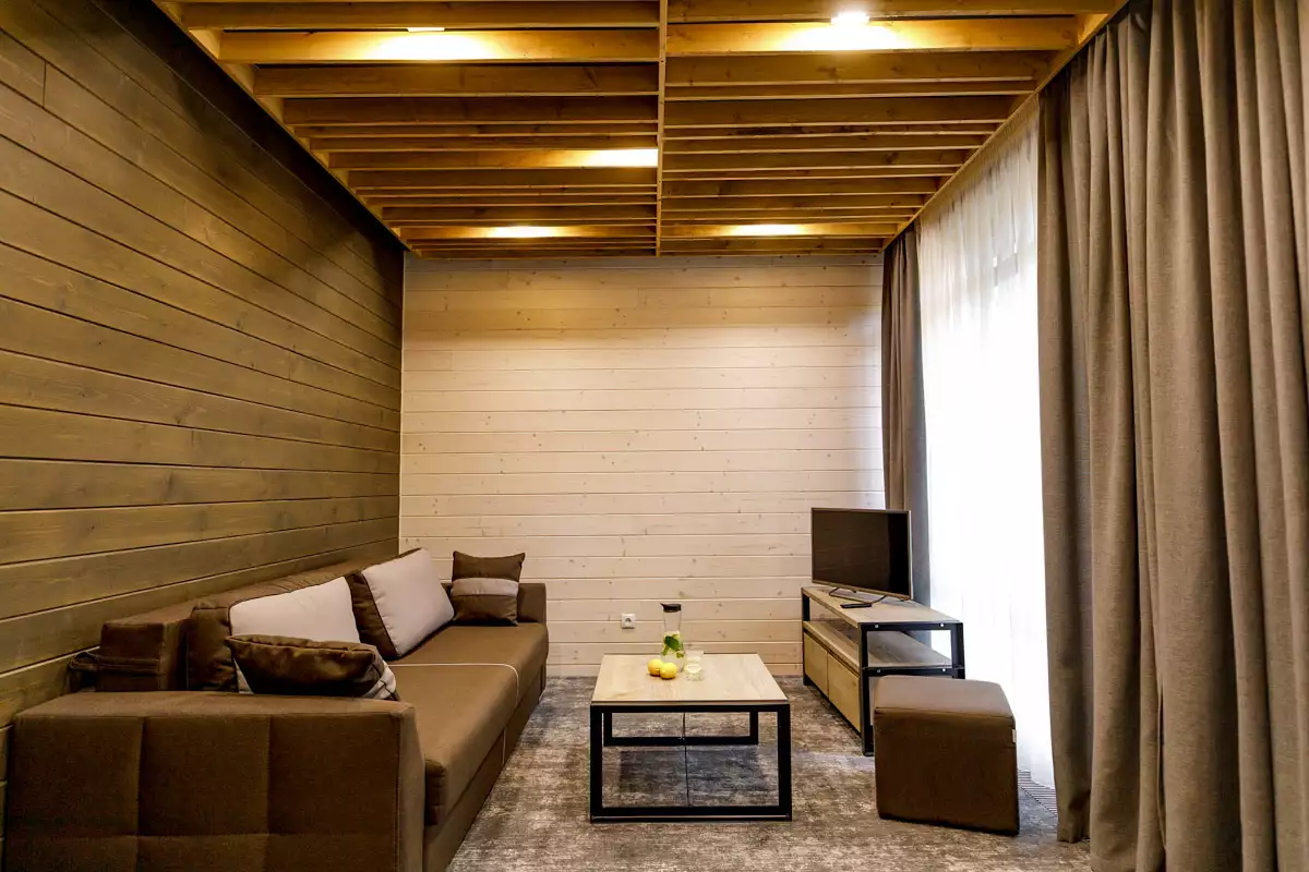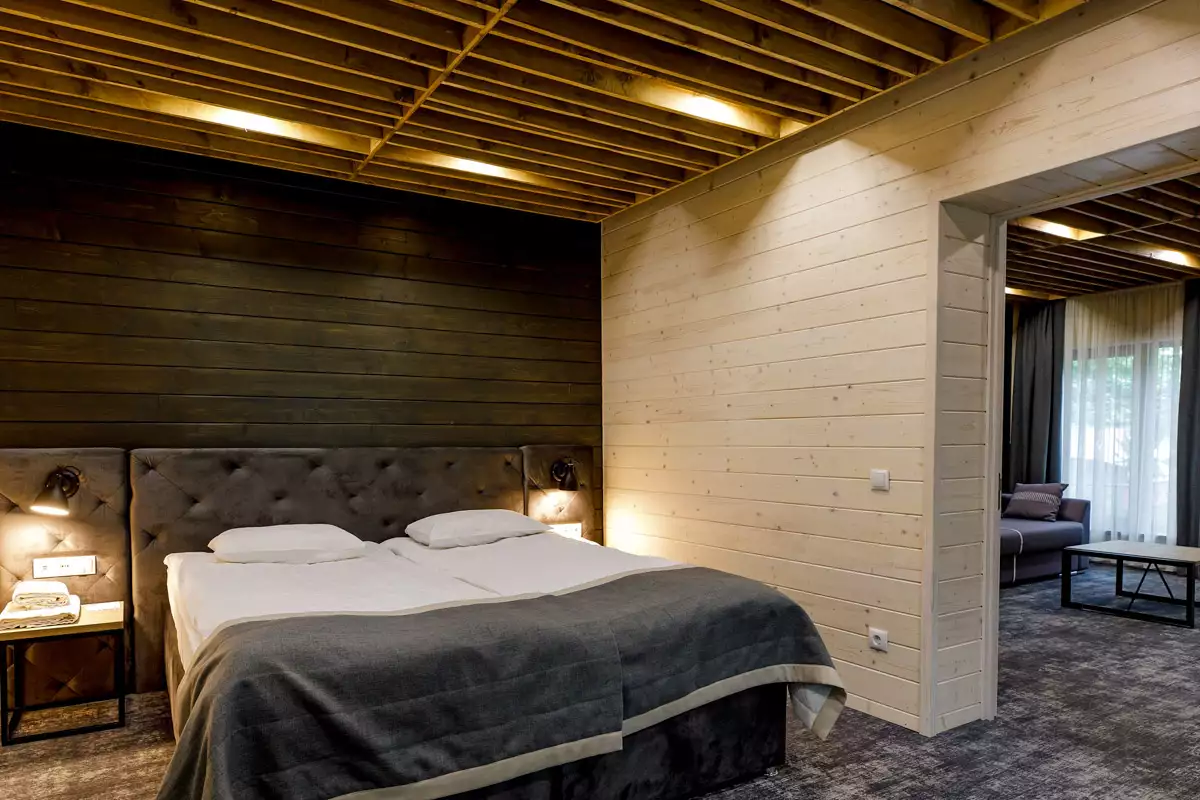 Просторный двухкомнатный номер “Люкс” с уютной гостевой комнатой. В ванных комнатах есть ванные и душевые.