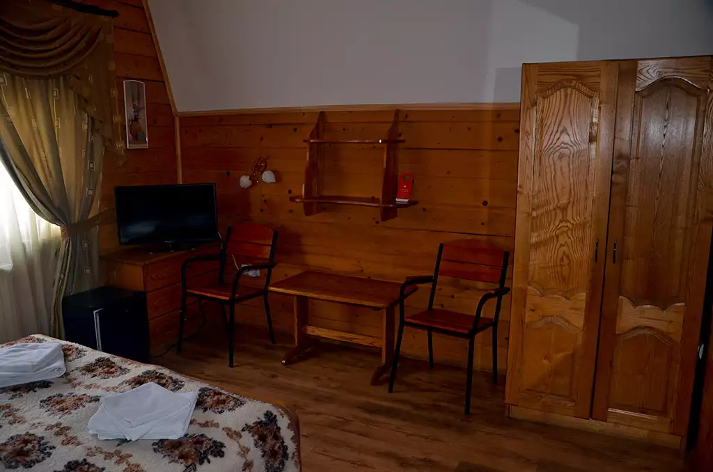 Стильный и просторный номер на третьем этаже с видом на горы без балкона. В номере: двуспальная кровать, ванная комната, вместительный шкаф, высокоскоростной интернет, плазменный телевизор.