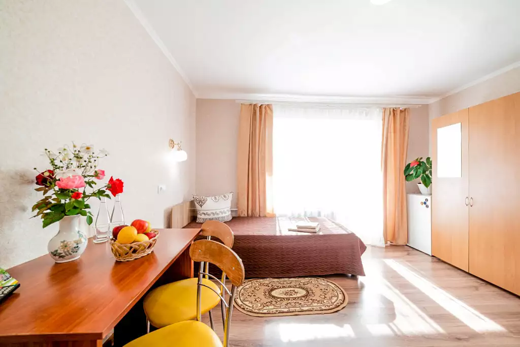 Стандарт (комплектация номера): душ, санузел, холодильник, телевизор, с балконом.